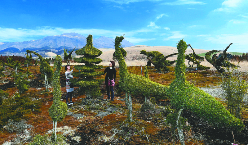 The topiary art pieces are placed along the Yamanami Highway, a roughly 50 kilometer-long road on a high plateau that connects Aso, Kumamoto Prefecture, and Yufuin, Oita Prefecture.