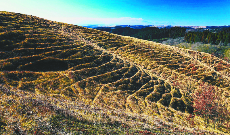 The endless blue sky was spread out above me and a range of hills and the five peaks of Mt. Aso and the Kuju-renzan mountain range in Ubuyama, Kumamoto Prefecture, made for quite the beautiful scene. Among the magnificent view that makes the image of the savanna in Africa come to mind, roughly 800 green objects shaped like various birds and beasts stand, posed as though they were playing with one another.