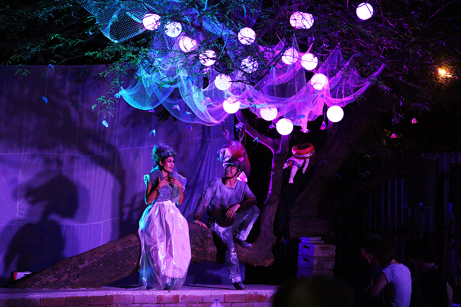 B-floor's co–artistic director and co-founder Jaa Phantachat transformed Angoon's Garden in the middle of Thonglor into a magical dreamscape for her production of A Midsummer Night's Dream: Fan Klang Suan (Dreaming In The Garden). This is not Jaa's first handling of the bard's work. In 2012, she adapted King Lear into a political dance theatre piece, Lear & His Three Daughters. While her King Lear adaptation offers a serious critique of Thai people's relationship with its most hallowed institution, her Midsummer Night's Dream adaptation offers only a brief reflection on the relationship between small-time artists and political institutions. It's more of a tribute to theatre and theatre artists, not just any kind of theatre and theatre artists, but the struggling alternative kind, somewhat like the play's motley band of mechanicals putting up their raggedy theatre production.