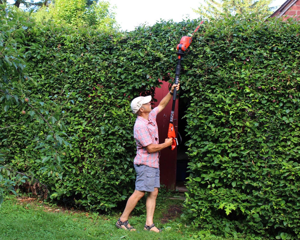 Why put a hedge trimmer on the end of a pole? For tall hedges, of course! A nice feature of most pole hedge trimmers is that the angle of the head can be varied, a useful feature if you’re trimming the top of a high hedge to be flat.