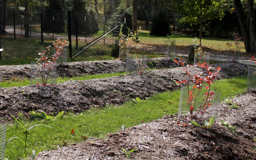 Rather than lower the water level beneath your plants’ roots, you could get them air by raising them above the water. Trees and shrubs can be planted on raised mounds. The mounds need to be plenty wide to allow roots to spread. How wide depends on the eventual size of the plant.