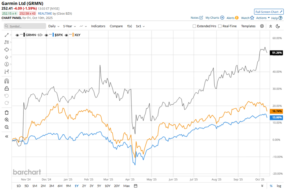 Shares of Garmin have climbed 53.4% over the past 52 weeks, outperforming both the S&P 500 Index's ($SPX) nearly 15% gain and the Consumer Discretionary Select Sector SPDR Fund's (XLY) 17.2% return over the period.