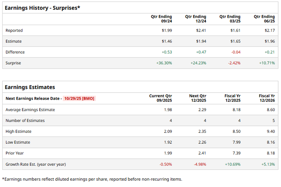 The Schaffhausen, Switzerland-based company is expected to announce its Q3 2025 results before the market opens on Wednesday, Oct. 29. Ahead of this event, analysts expect Garmin to report an adjusted EPS of $1.98, down marginally from $1.99 in the year-ago quarter. It has exceeded Wall Street's earnings estimates in three of the last four quarters while missing on another occasion.
