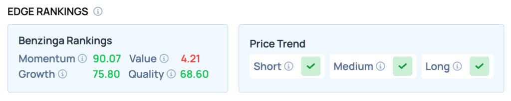 Tesla scores well on Momentum, Quality and Growth metrics, but offers poor Value. Tesla also offers a favorable price trend in the Short, Medium and Long term. For more such insights, sign up for Benzinga Edge Stock Rankings today!
