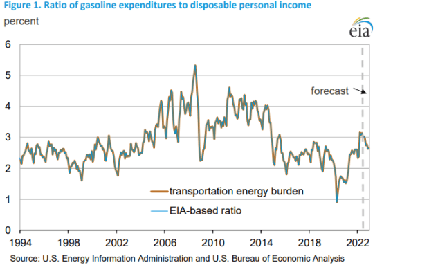 "Taken together, the rise in disposable personal incomes for the average American since 2008 has more than offset changes in gasoline prices. Looking ahead in the short run, our projections show gasoline prices in 2022 pushing the ratio of gasoline spending to disposable personal income to its highest level since 2014," the EIA said.