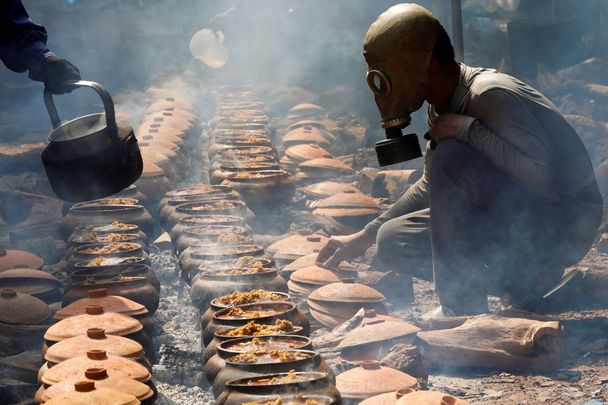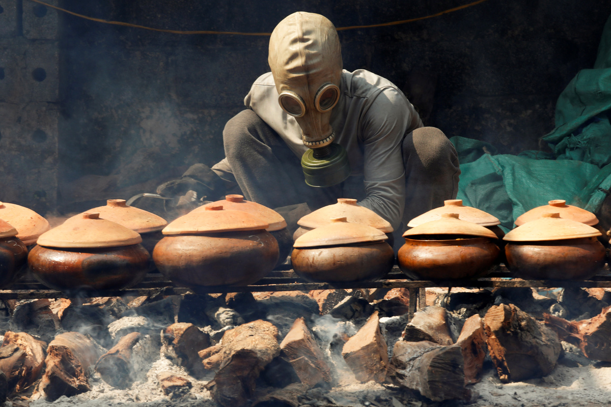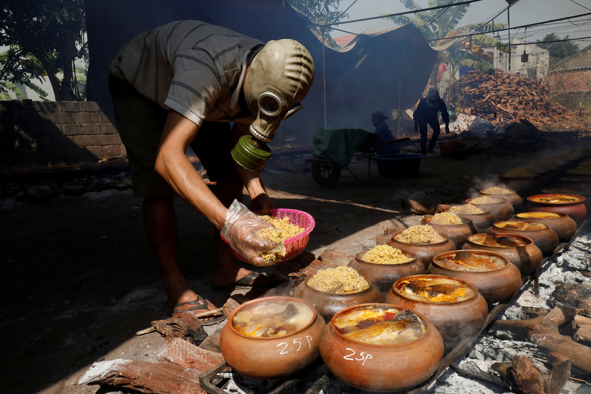 With a gas mask on, Bui Van Cuong tends to hundreds of clay pots filled with bubbling braised fish, a traditional delicacy popular in northern Vietnam during the Tet Lunar New Year holiday.