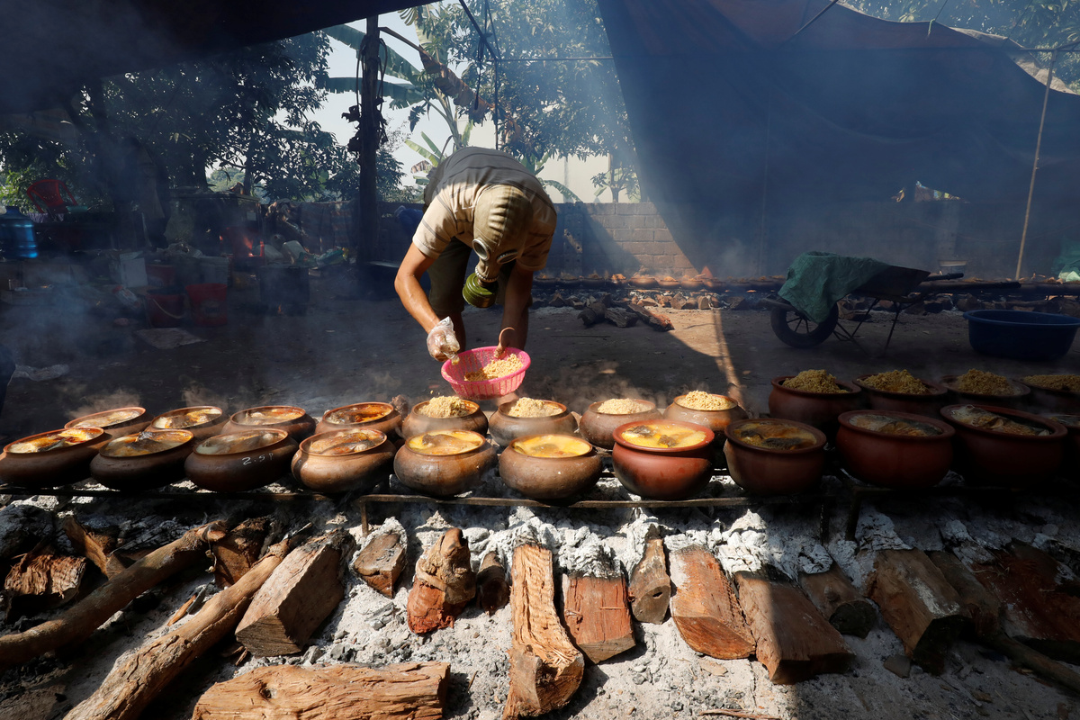 The mask helps Cuong work amid the smoke from the firewood burning beneath the clay pots of black carp that he cooks in the yard of his employer, Tran Duc Phong, in Dai Hoang, a Red River Delta village surrounded by verdant rice fields about 100 km (62 miles) from the capital, Hanoi.
