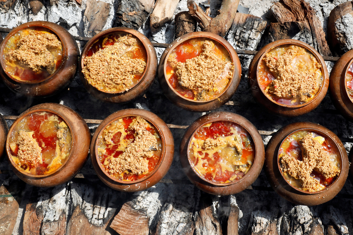 The black carp, each weighing 4-6 kg (9-13 pounds), are carefully selected and cleaned, cut and marinated, then cooked with a broth made from freshwater crabs mixed with spices, soy sauce, coconut milk and sugar. A root similar to ginger called galangal is placed on the bottom of the pots to prevent the fish from burning.
