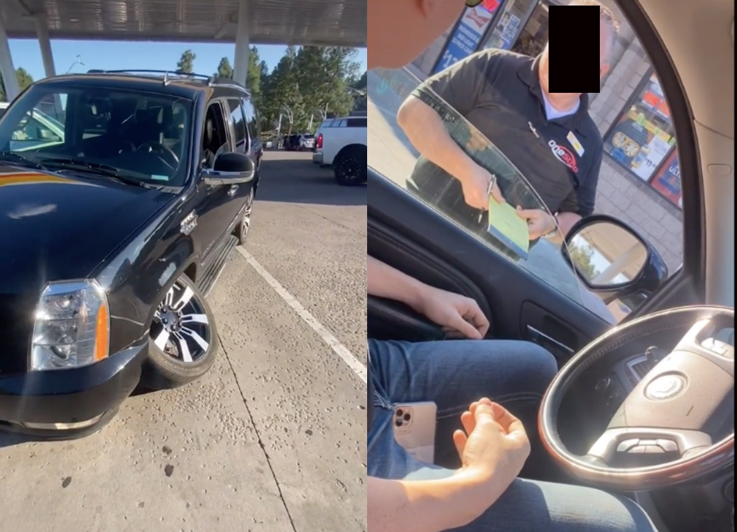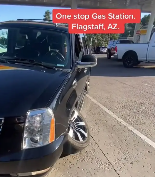 It would appear clear from the video that the car is unable to move due to it only having three wheels however, despite this, the apparent manager of the One-Stop Liquor and Convenience Store in Flagstaff, Arizona – which is part of the gas station – proved to be unsympathetic to their situation.