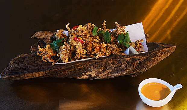 Best of all are the Thai-influenced tapas. The Soft Shelled Crab Kiew Waan showcases succulent and ever so easy to bite soft shelled crab served up with Thai eggplants, green curry, and coconut foam, a dish which is as photogenic as it is delicious. Other winning choices include the Prawn Tom Yum Rolls, where Vietnamese-style spring rolls use fresh prawns and are accompanied by a piquant tom yum sauce, and the Thai Fried Squid Legs, which use a Sriracha mayonnaise and larb meat salad spice combination to make a mouthwatering sauce for dipping in.