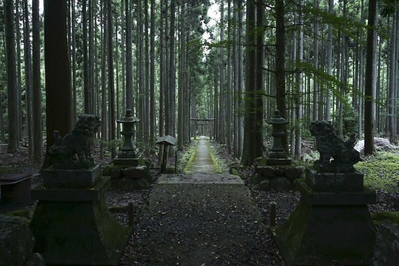 After walking up the stone pathway toward the shrine -- about 150 steps -- visitors are treated to a surreal view behind them. The approach, shrouded in cedar trees, features a pair of komainu guardian dog statues, stone lanterns and a torii gate deep in the background.