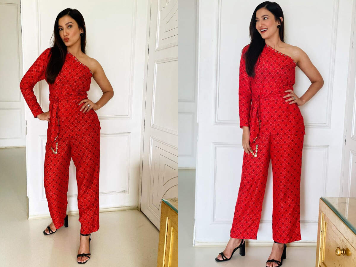 Gauahar stunned in a bright red bandhani co-ord set by Label Anushree. Bandhani is the famous tie and dye print textile produced primarily in Gujarat and Rajasthan. It features tiny bindings that look exotic and beautiful.