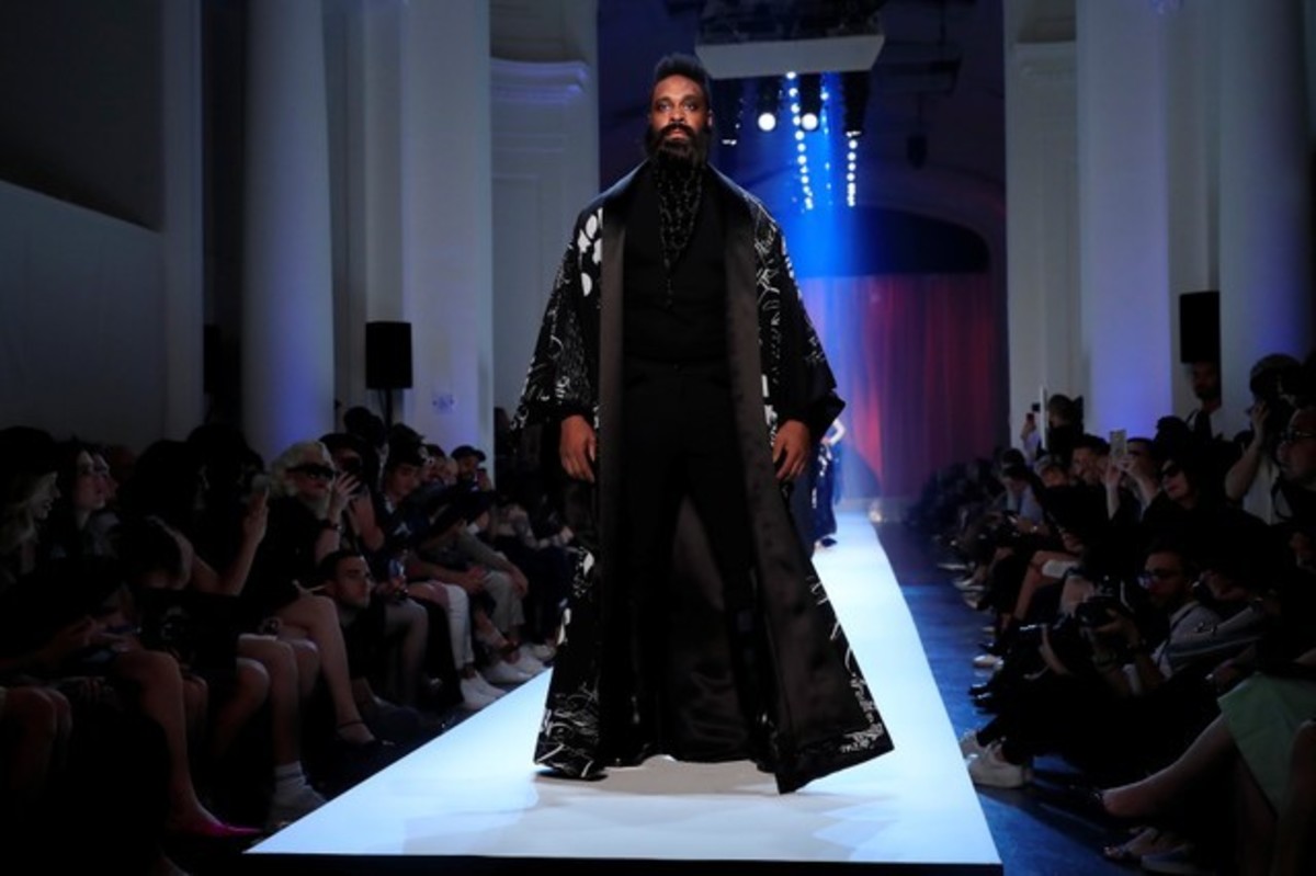 The collection also featured a pair of male and female models walking in step and showcasing their breasts behind transparent panels with the slogan "Free the nipple".