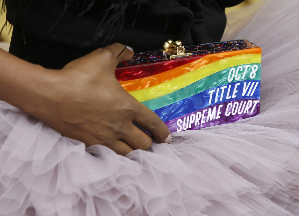 Transgender actress Laverne Cox, who was nominated for outstanding guest actress in a drama series for a role in "Orange Is the New Black," came to the show sporting a rainbow-colored handbag emblazoned with the date Oct. 8, which is when the U.S. Supreme Court will hear three related cases on whether gay and transgender people are protected from workplace discrimination by a landmark federal civil rights law.