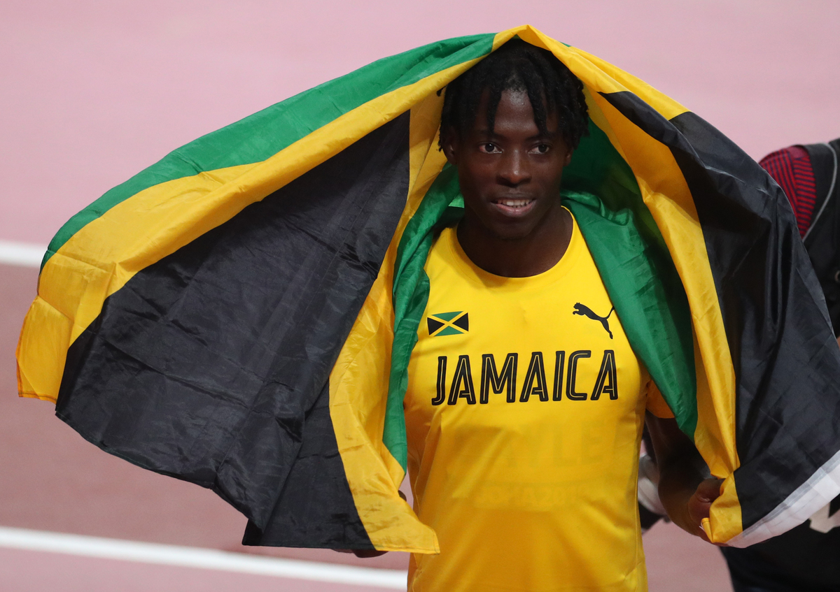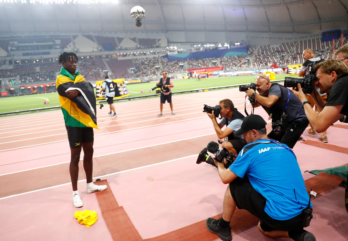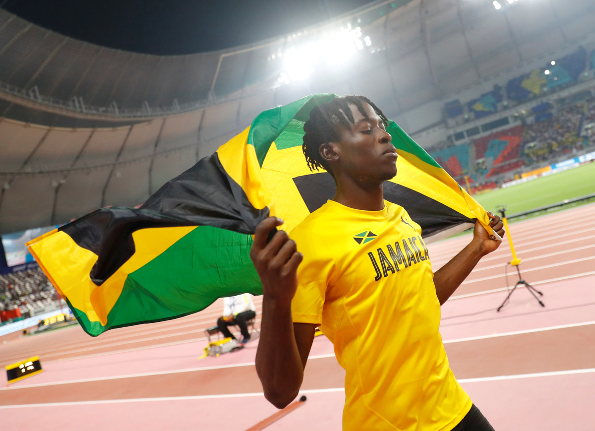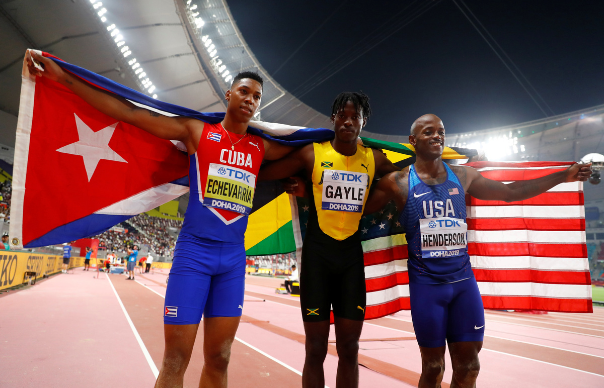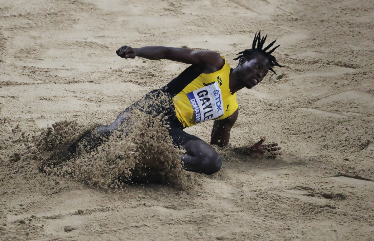 Athletics - World Athletics Championships - Doha 2019 - Men's Long Jump Final - Khalifa International Stadium, Doha, Qatar - September 28, 2019 Jamaica's Tajay Gayle celebrates winning gold REUTERS/Hannah MckayAthletics - World Athletics Championships - Doha 2019 - Men's Long Jump Final - Khalifa International Stadium, Doha, Qatar - September 28, 2019 Jamaica's Tajay Gayle celebrates winning gold REUTERS/Kai Pfaffenbach