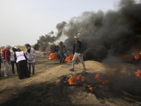 Huge black plumes of smoke from burning tires engulfed the border area Friday. Some of the activists threw stones toward the fence or flew kites with flaming rags dangling from their tails.