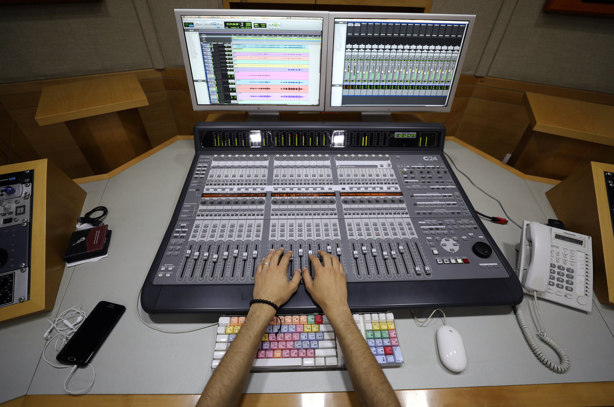 An editor works on one of the songs of Palestinian rapper Ibrahim Ghunaim (MC Gaza), in a studio in Gaza City, August 24, 2017. REUTERS/Mohammed Salem