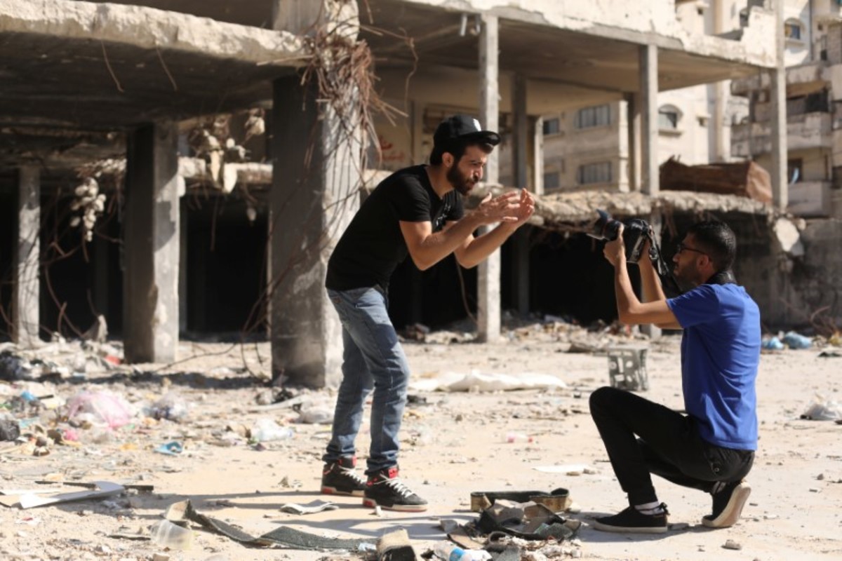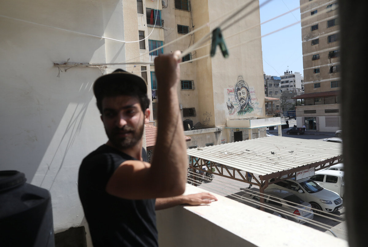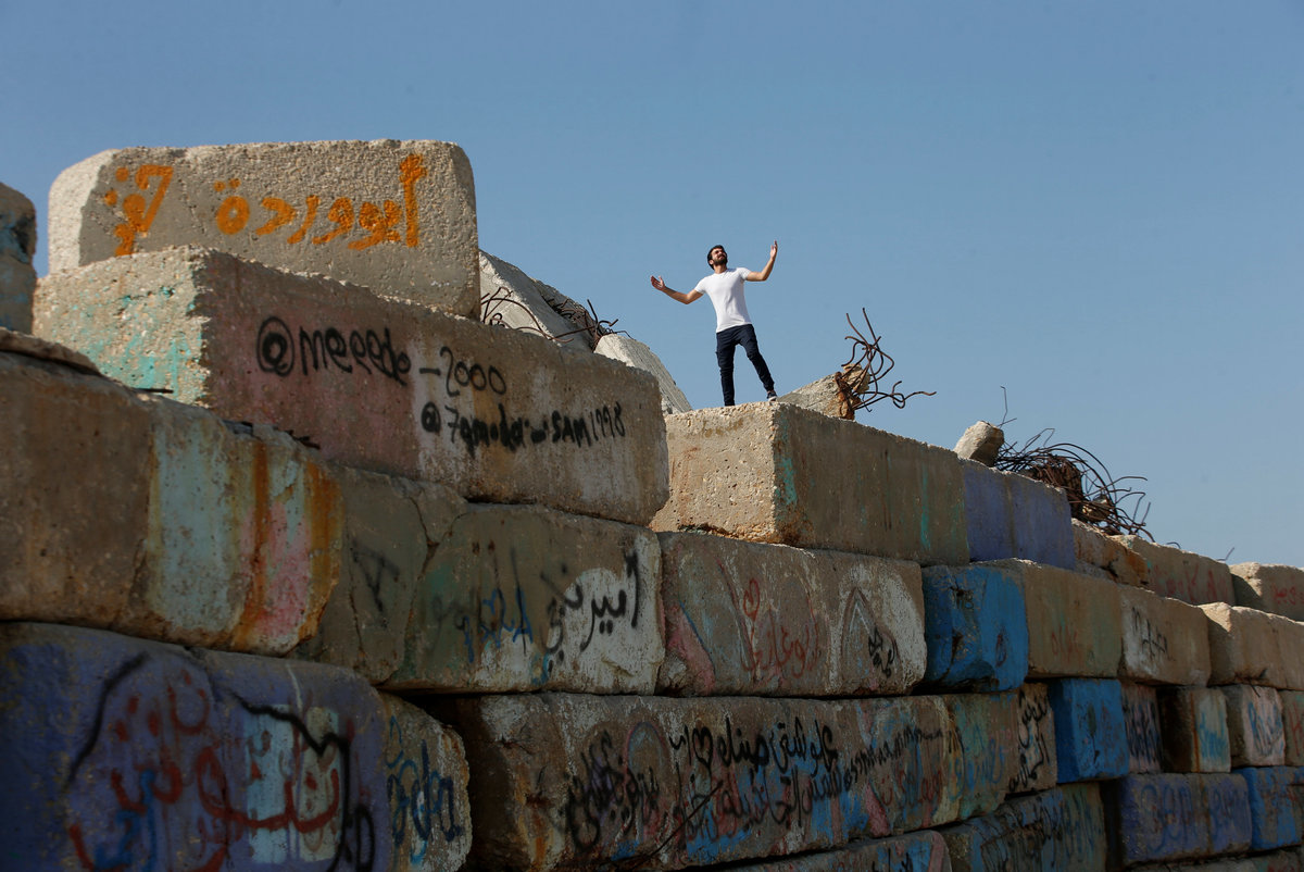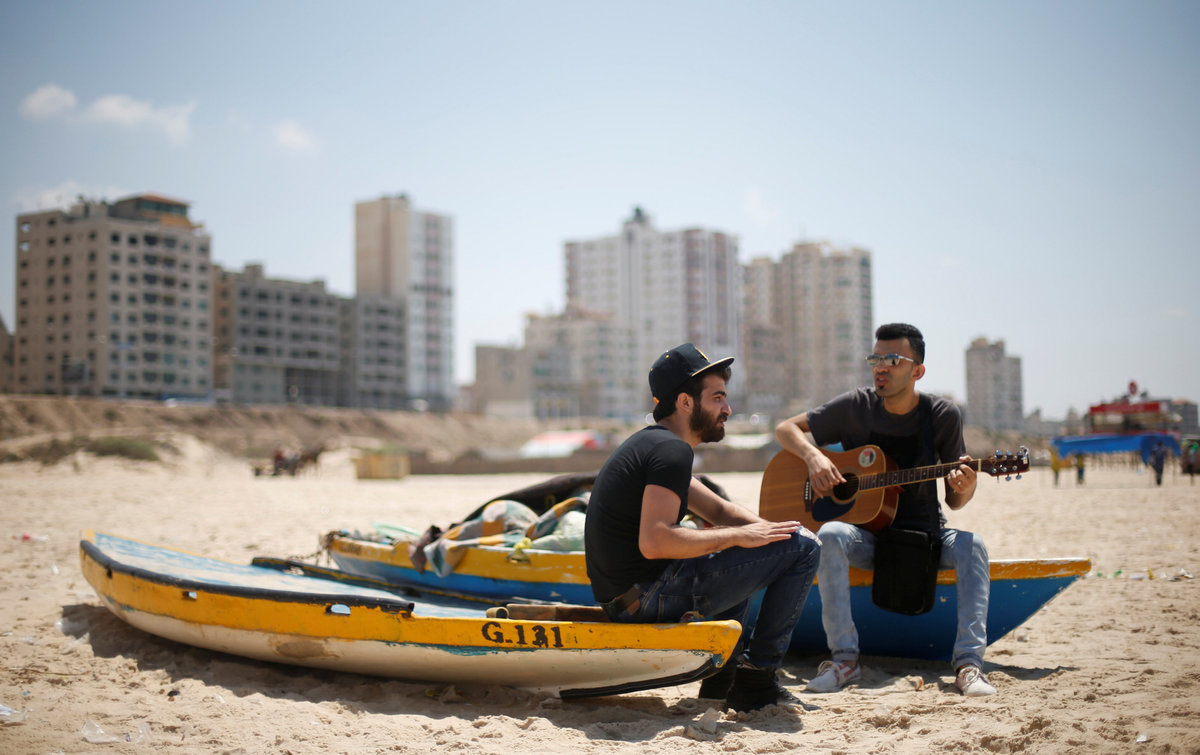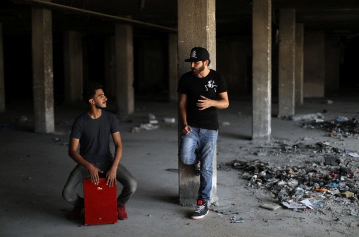 Palestinian rapper Ibrahim Ghunaim (MC Gaza) is filmed as he performs in front of destroyed buildings in Gaza City, August 18, 2017. REUTERS/Mohammed Salem Palestinian rapper Ibrahim Ghunaim (MC Gaza) teaches children about rap, in Gaza City, August 17, 2017. REUTERS/Mohammed Salem Palestinian rapper Ibrahim Ghunaim (MC Gaza) practices his songs inside a damaged building in Gaza City, August 18, 2017. REUTERS/Mohammed Salem Palestinian rapper Ibrahim Ghunaim (MC Gaza) prays in a mosque in Gaza City, August 24, 2017. REUTERS/Mohammed Salem Palestinian rapper Ibrahim Ghunaim (MC Gaza) looks on as a child gestures, at his video game shop in Gaza City, August 16, 2017. REUTERS/Mohammed Salem Palestinian rapper Ibrahim Ghunaim (MC Gaza) stands on the balcony of his house, with a mural depicting late Palestinian leader Yasser Arafat, shown in the background on a wall in Gaza City, August 16, 2017. REUTERS/Mohammed Salem Palestinian rapper Ibrahim Ghunaim (MC Gaza) kisses his mother, as his brother who has Down syndrome looks on, at their family home in Gaza City, August 16, 2017. REUTERS/Mohammed Salem Palestinian rapper Ibrahim Ghunaim (MC Gaza) practices his songs in his room, at home in Gaza City, August 15, 2017. REUTERS/Mohammed Salem Palestinian rapper Ibrahim Ghunaim (MC Gaza) cooks with his mother at their home in Gaza City, August 16, 2017. REUTERS/Mohammed Salem Palestinian rapper Ibrahim Ghunaim (MC Gaza) (L) performs with a friend on a beach in Gaza City, August 16, 2017. REUTERS/Mohammed Salem People celebrate during a wedding party in Gaza City, August 22, 2017. REUTERS/Mohammed Salem Palestinian rapper Ibrahim Ghunaim (MC Gaza) performs at the seaport of Gaza City, August 15, 2017. REUTERS/Mohammed Salem Palestinian rapper Ibrahim Ghunaim (MC Gaza) (2nd L) watches a soccer match with his friends on a rooftop in Gaza City, August 16, 2017. REUTERS/Mohammed Salem