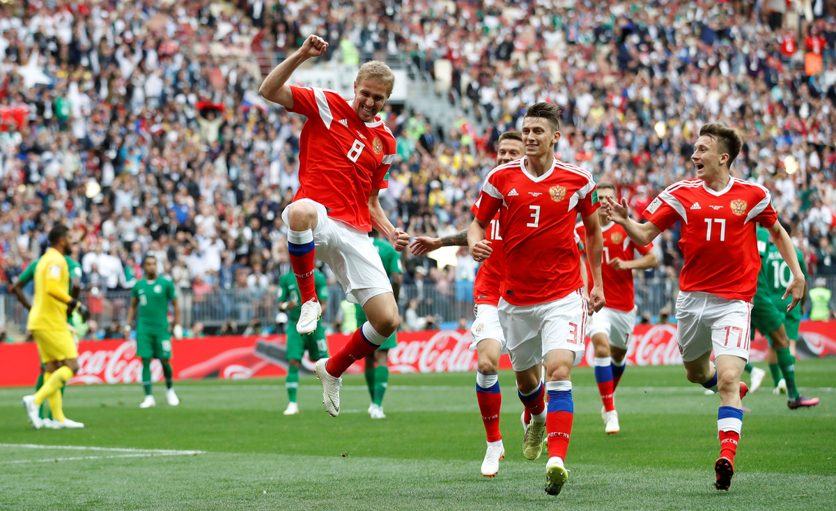 MOSCOW (Reuters) - Yury Gazinsky took 12 minutes to score the opening goal of the World Cup and substitute Denis Cheryshev added a second as hosts Russia made a dream start to the tournament and led Saudi Arabia 2-0 at halftime at the Luzhniki Stadium on Thursday.