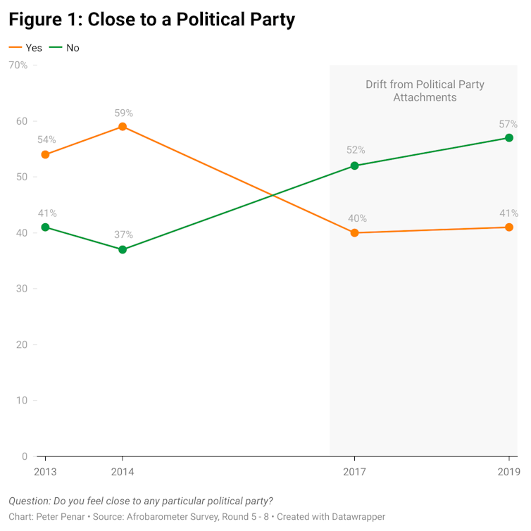 The boycott highlights the opposition vacuum since the 2010 disputed election. According to Gbagbo loyalists, the vacuum can only be filled by him. But the debate reflects deeper trends of political party alignment in Côte d’Ivoire. In the last five years, the realignment has accelerated, with 57% of Ivorians indicating that they do not feel close to a political party.