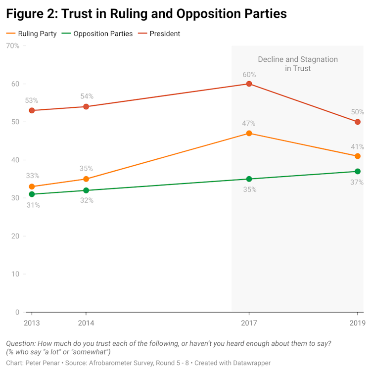 Citizens are also increasingly critical of ruling and opposition parties. Ruling party trust is firmly under 50% and declined to 41% in 2019. Trust in opposition parties has largely stagnated during Gbagbo’s absence.