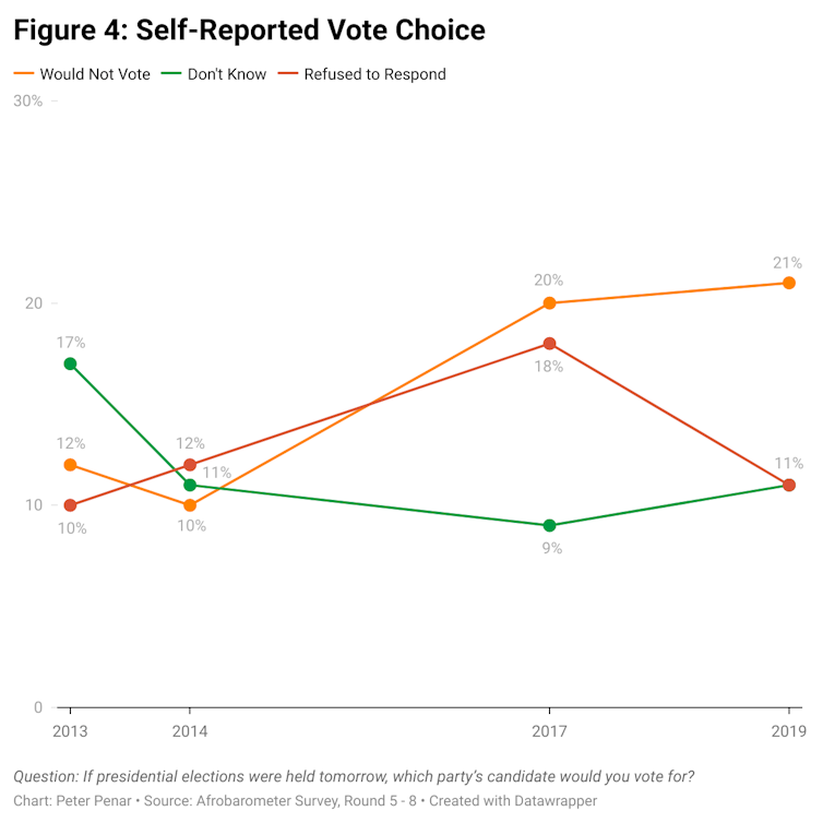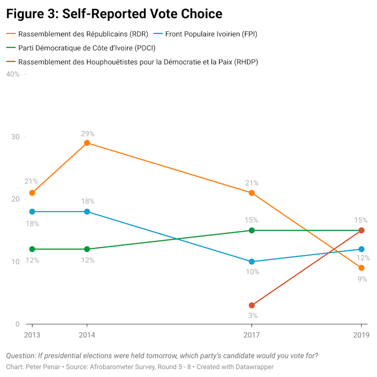 The realignment also shows in citizens’ voting preferences over the past ten years. Ouattara’s Rassemblement des Républicains has seen a decline in support as Ouattara has cobbled together political alliances under the Rassemblement des Houphouëtistes pour la Démocratie et la Paix banner, which Ouattara emphasizes as his electoral vehicle. Opposition parties have stagnated. The Front Populaire Ivoirien received only 12% of self-reported support in the 2019 Afrobarometer survey.
