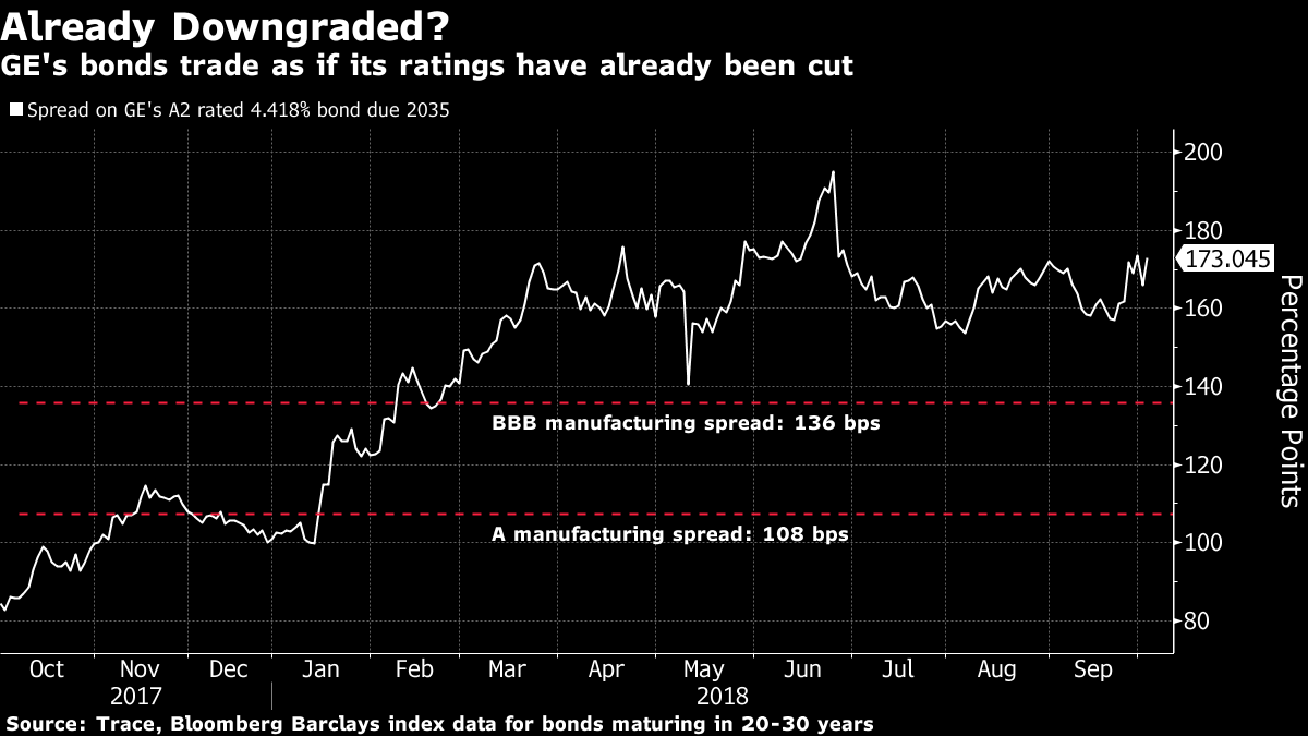 S&P Global Ratings on Tuesday cut GE’s bond grades to three steps above junk. Moody’s Investors Service and Fitch Ratings have said within the last 24 hours that they may downgrade GE’s debt as well, citing trouble at the company’s power unit. Debt markets have expected such moves for most of this year, and its bonds trade as if they’re in the lowest reaches of investment-grade, said Joel Levington, senior credit analyst at Bloomberg Intelligence.