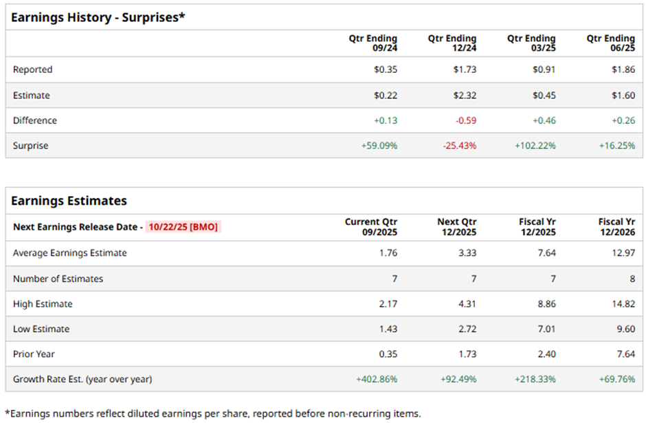 The Cambridge, Massachusetts-based company is expected to release its fiscal Q3 2025 results before the market opens on Wednesday, Oct. 22. Ahead of this event, analysts project GEV to report an EPS of $1.76, a significant 402.9% growth from $0.35 in the year-ago quarter. The company has exceeded Wall Street's bottom-line estimates in three of the last four quarters while missing on another occasion.