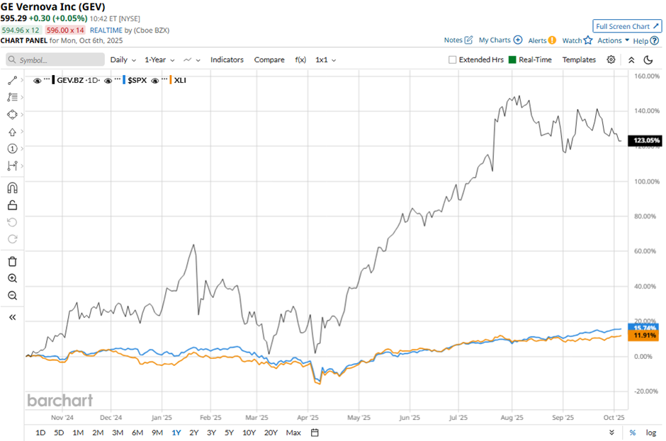 GEV stock has climbed 125.3% over the past 52 weeks, significantly outperforming the broader S&P 500 Index's ($SPX) 16.9% return and the Industrial Select Sector SPDR Fund's (XLI) 13.9% gain over the same period.