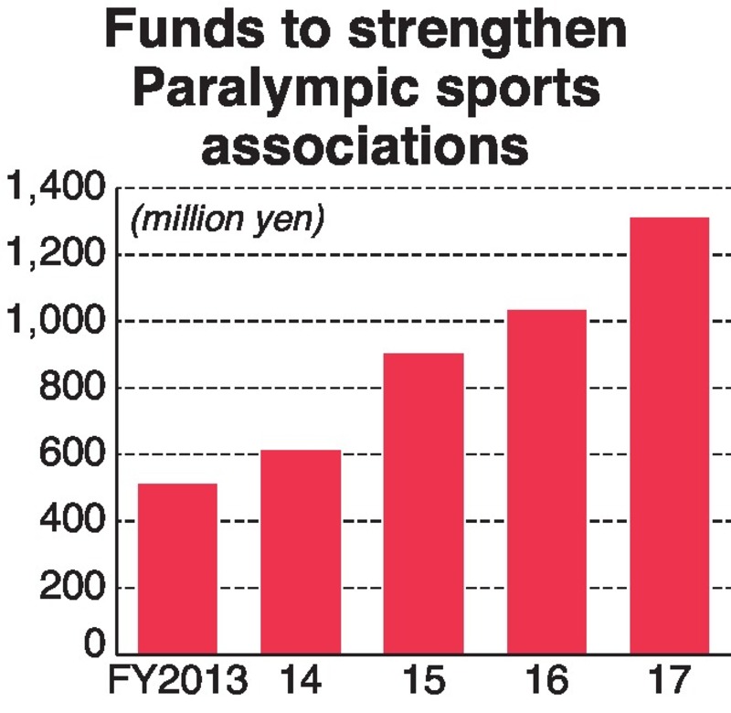 While there has been a sharp rise in government funds with an eye on developing Japan's athletes ahead of the Tokyo Paralympics, the number of full-time staff members has increased from 17 across 11 associations in the first year to 66 across 24 associations, including the JPC itself.