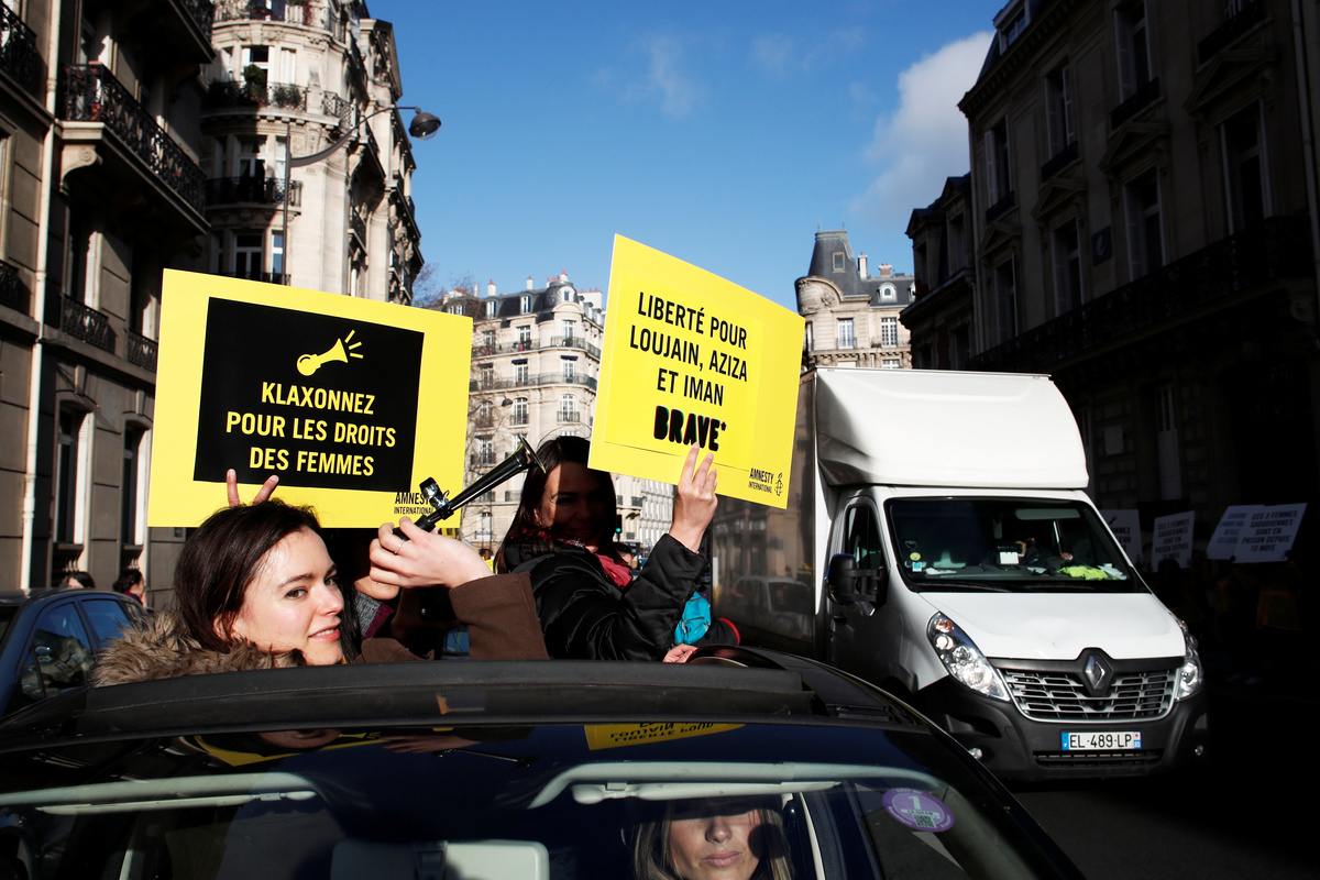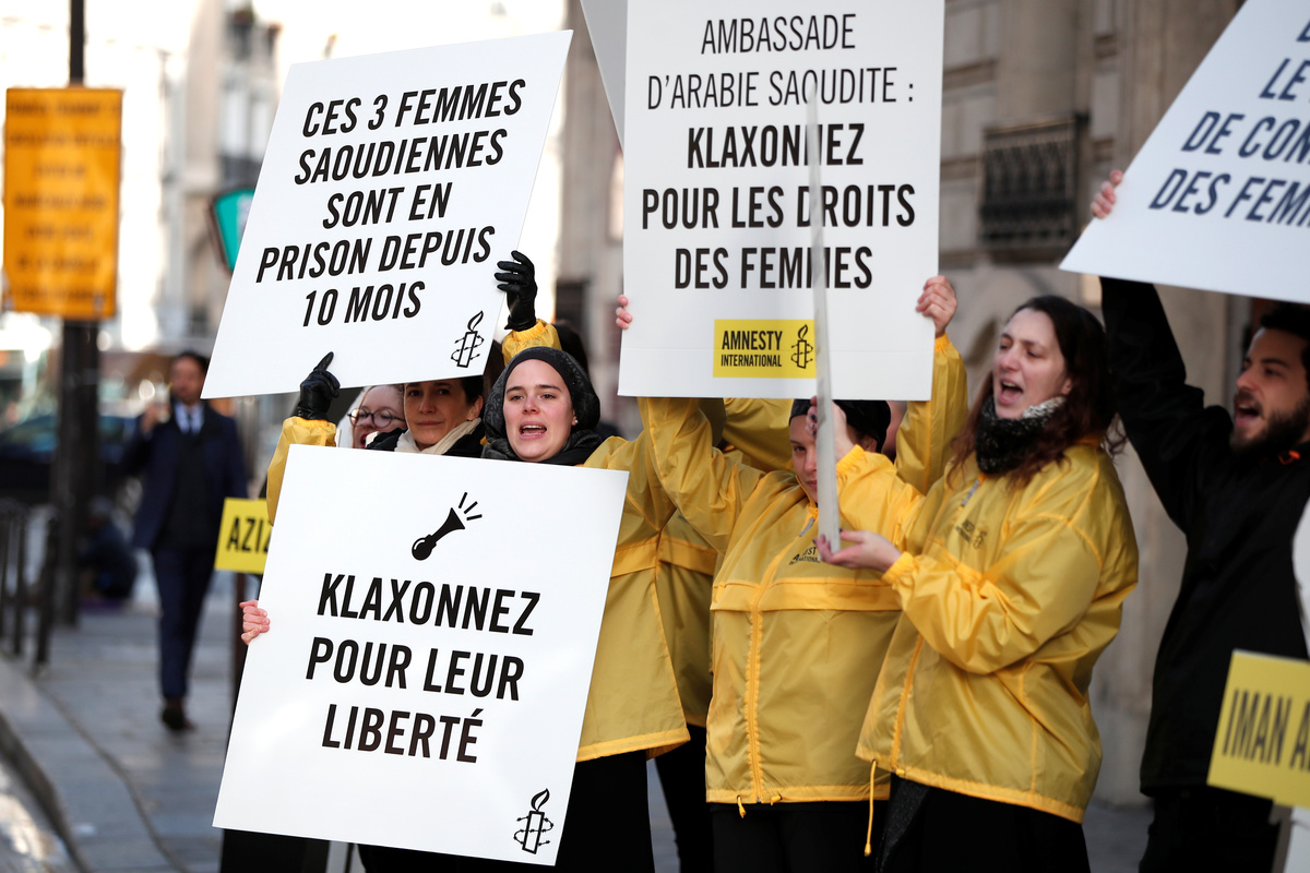 In Paris, demonstrators from Amnesty International waved placards outside the Saudi Arabian embassy that read "Honk for women's rights", and called for the release of jailed women activists, including some campaigners for the right to drive in the deeply conservative kingdom.