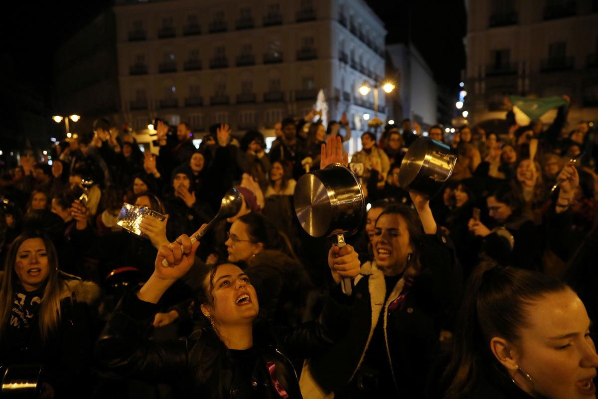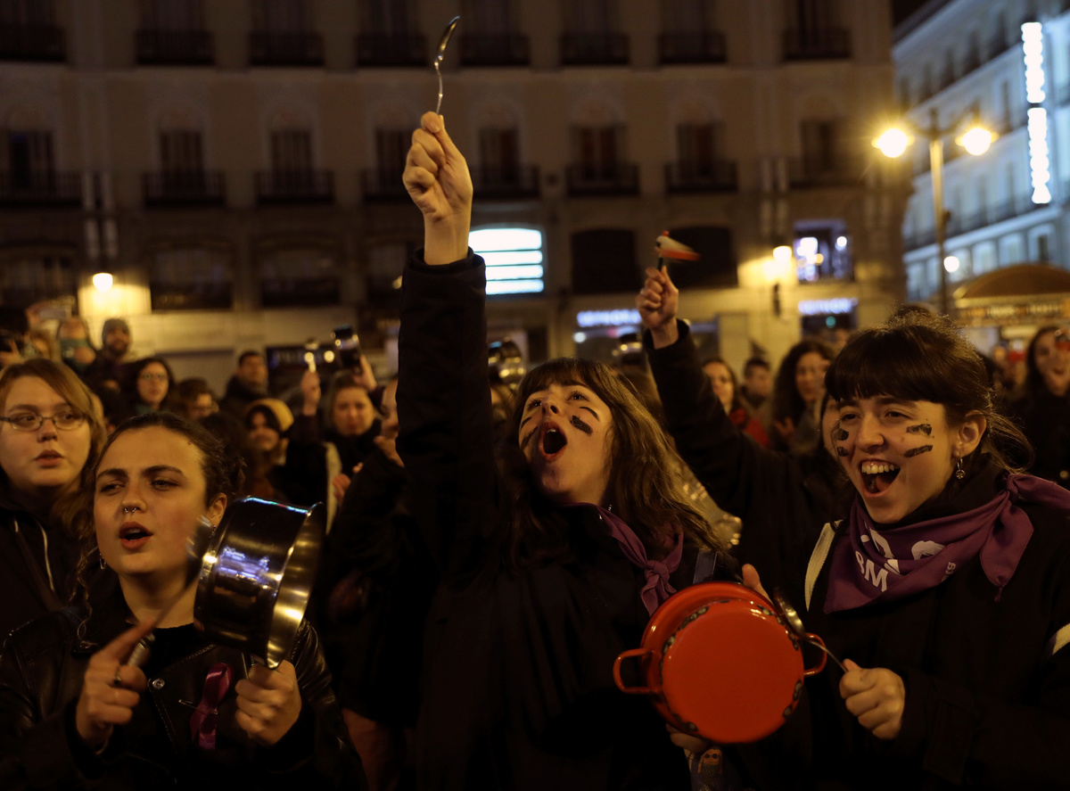 As the clock ticked past midnight, several hundred women gathered in central Madrid to bang pots and pans and demand more rights for women in a society they say is still dominated by men.