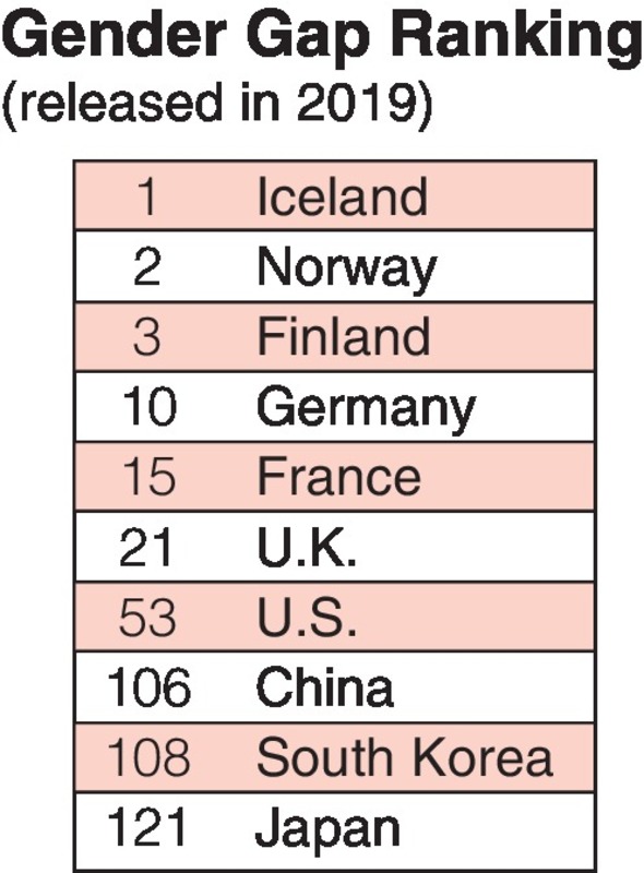Japan came in at a record low of 121st in the gender equality ranking released in December 2019. Low female participation in politics in the roles of Cabinet ministers and Diet members, as well as a low rate of managerial positions by women in the economic sector were major reasons for the ranking.