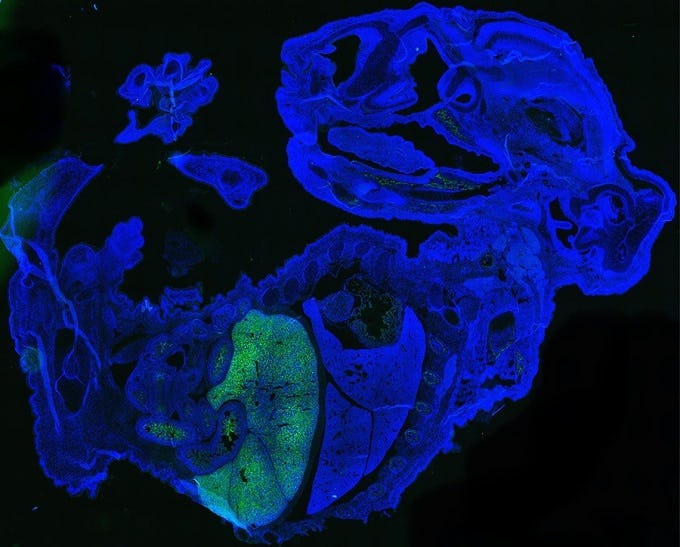 Those cells were present all over the nascent tissues in the mouse embryos, from retinal cells to red blood cells and liver cells.