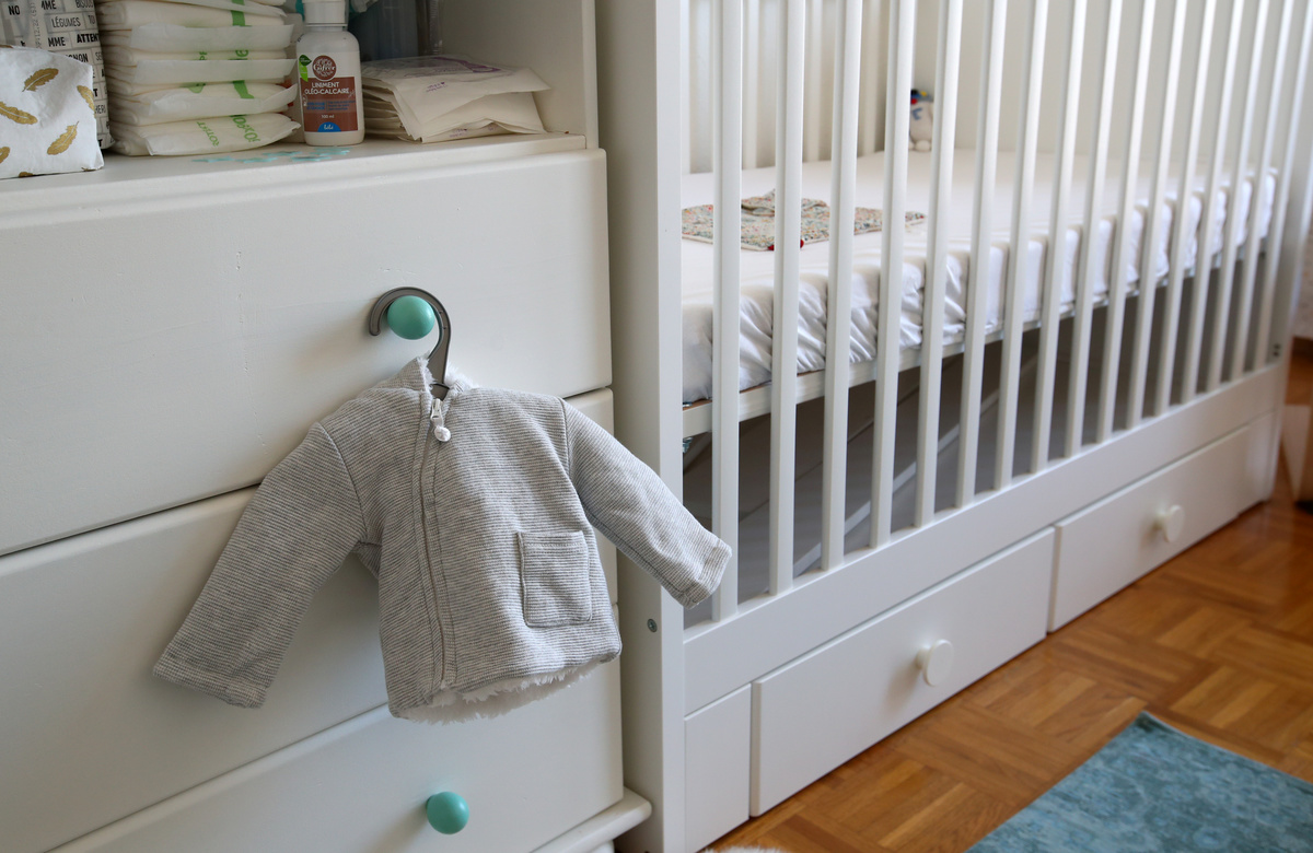 A jacket is pictured in a room of Noemie Bouchet and Arnaud Joal, who are expecting the birth of their first child very soon, during the coronavirus disease (COVID-19) outbreak in Geneva, Switzerland, April 8, 2020. REUTERS/Denis Balibouse