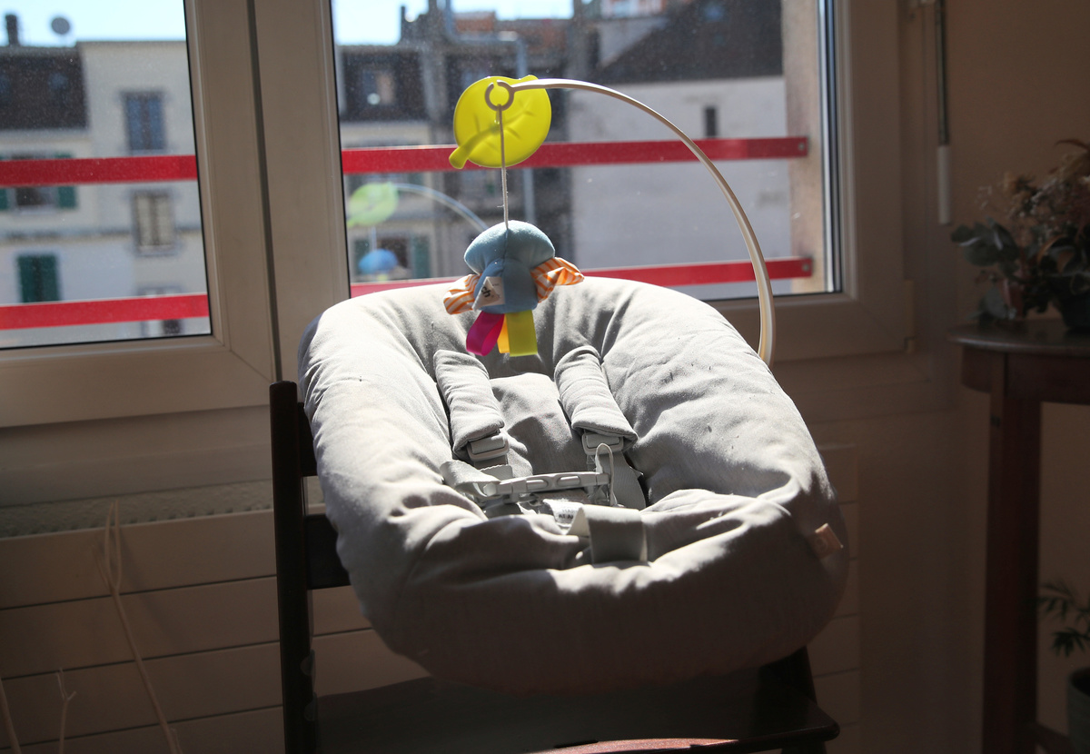 A baby seat is pictured in the flat of Noemie Bouchet and Arnaud Joal, who are expecting the birth of their first child very soon, during the coronavirus disease (COVID-19) outbreak in Geneva, Switzerland, April 8, 2020. REUTERS/Denis Balibouse