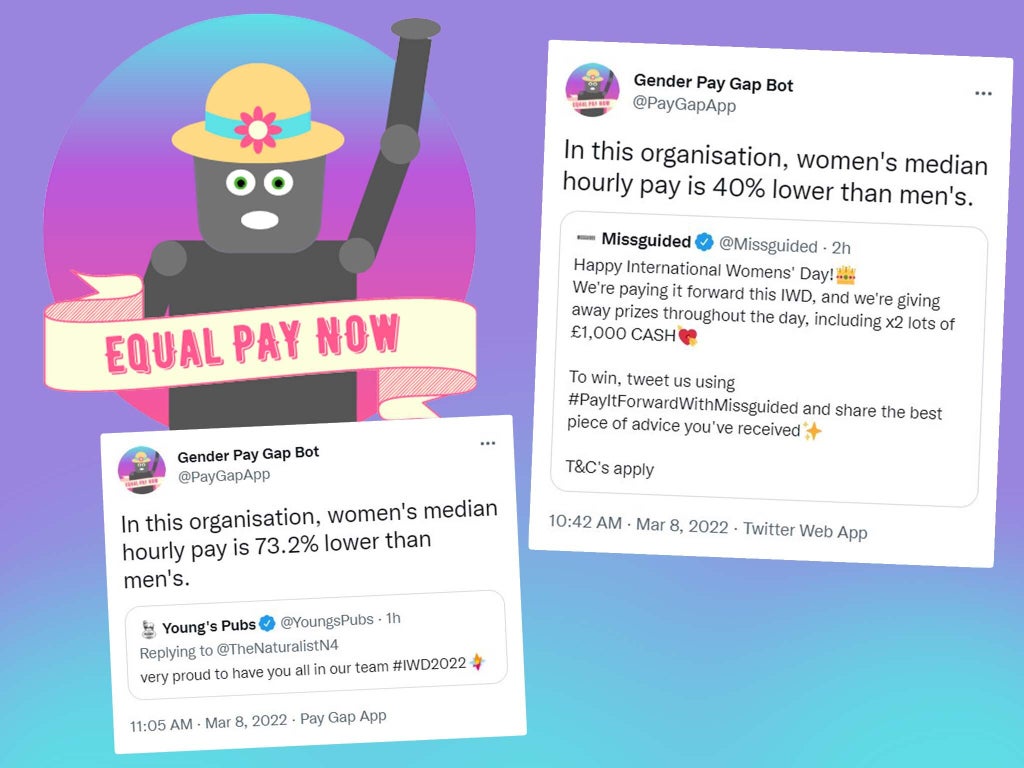 “Today I am mostly obsessed with the [Gender Pay Gap Bot]. A bot that [retweets] any company tweeting about #IWD2022 highlighting their gender pay gap. It is hilarious and depressing in equal measures,” a third person wrote.