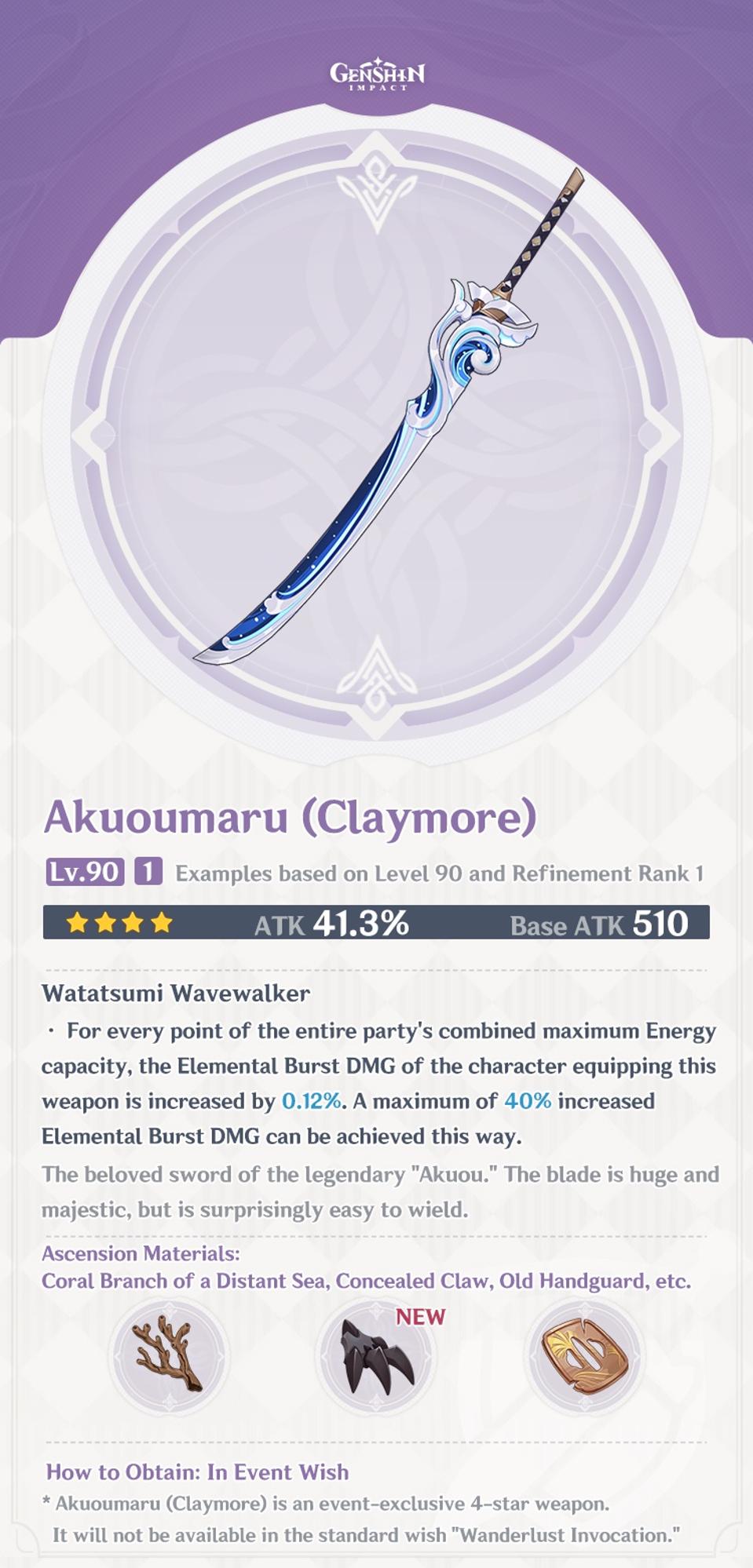 Watatsumi Wavewalker - For every point of the entire party's combined maximum Energy capacity, the Elemental Burst DMG of the character equipping this weapon is increased by 0.12%. A maximum of 40% increased Elemental Burst DMG can be achieved this way.
