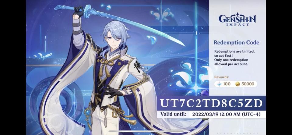 - UT7C2TD8C5ZD – 100 Primogems, 50,000 Mora