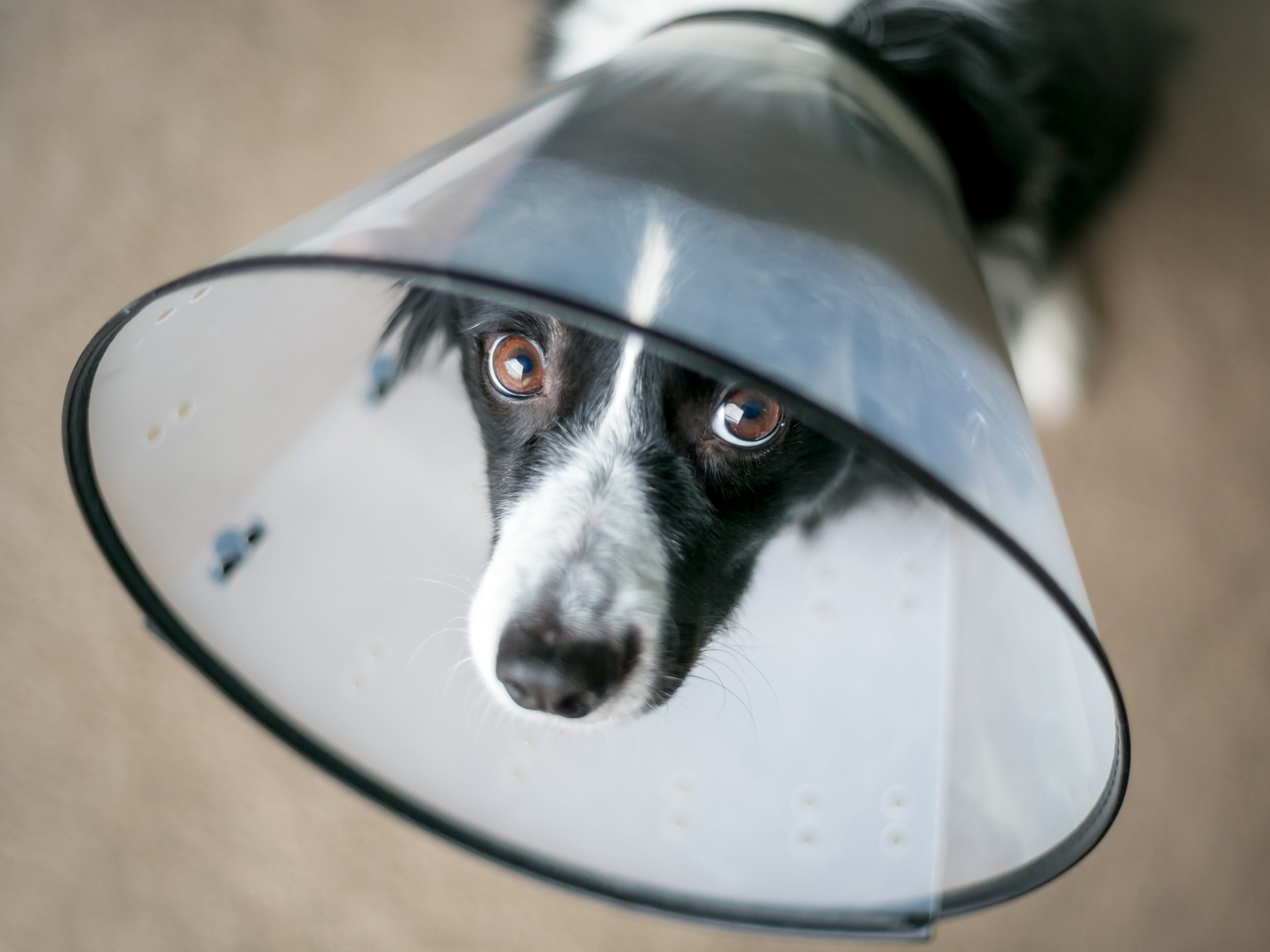 A Border Collie dog wearing a protective Elizabethan collar after surgery
