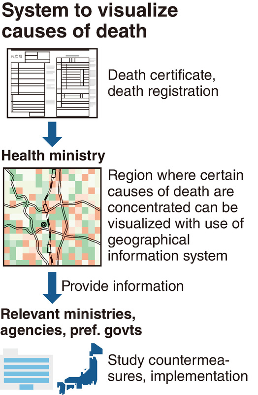 The government will utilize such information as the cause and time of death, and place of residence, which is included on death certificates written by doctors or death registrations submitted to local governments. The central government has already compiled statistics on causes of death that allows it to make a comparison of certain types of diseases on a municipal basis. However, there has been no system available to analyze causes on a regional basis.
