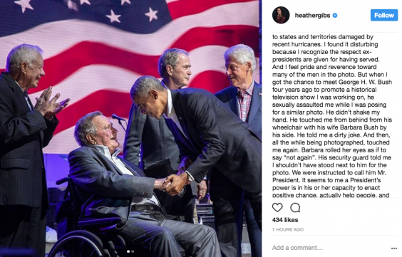 “When I got the chance to meet George HW Bush four years ago to promote a historical television show I was working on, he sexually assaulted me while I was posing for a similar photo,” she wrote.
