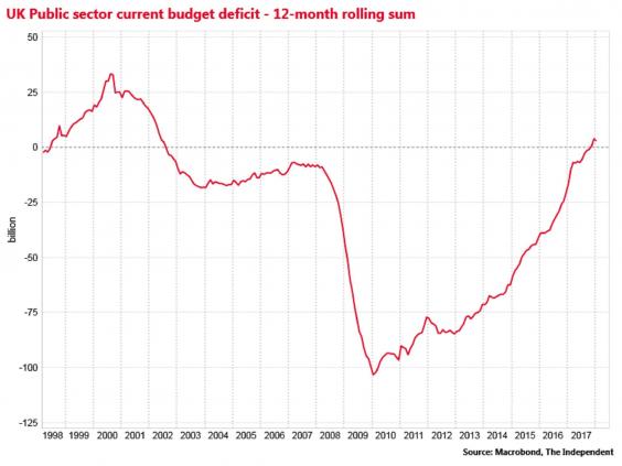 At that point the official forecaster was anticipating the UK’s current budget deficit to still be around £6.2bn in 2017-18, around 0.3 per cent of GDP, which now seems likely to be too pessimistic.