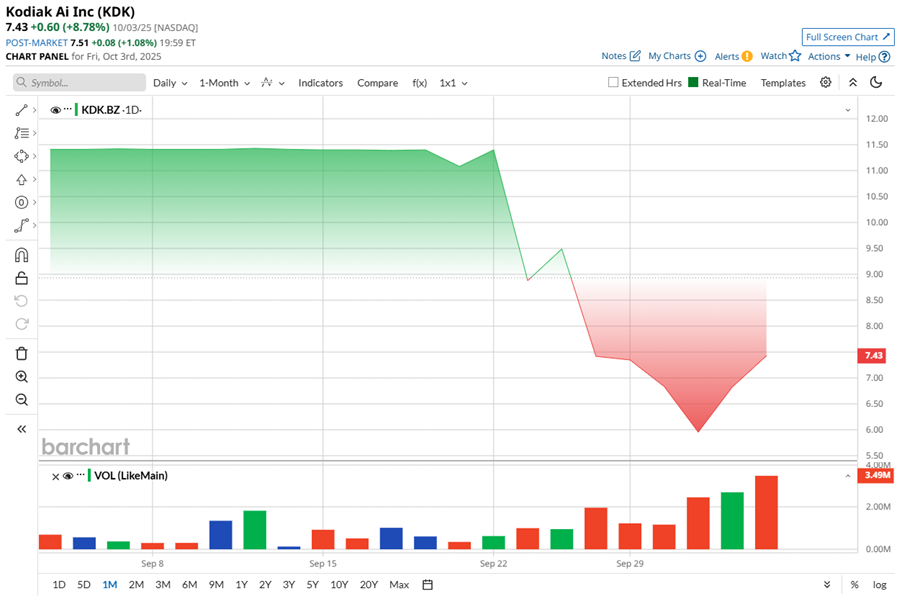 KDK stock's first days on the Nasdaq have been nothing short of a rollercoaster. After the debut hype faded, the stock stumbled, sliding 22% on Sept. 26 and continuing its descent through Sept. 30, weighed down by SPAC-related dilution fears and cash redemptions. By Oct. 1, KDK stock hit a rough patch, plunging nearly 13% to $5.96 as traders bailed on short-term hopes.