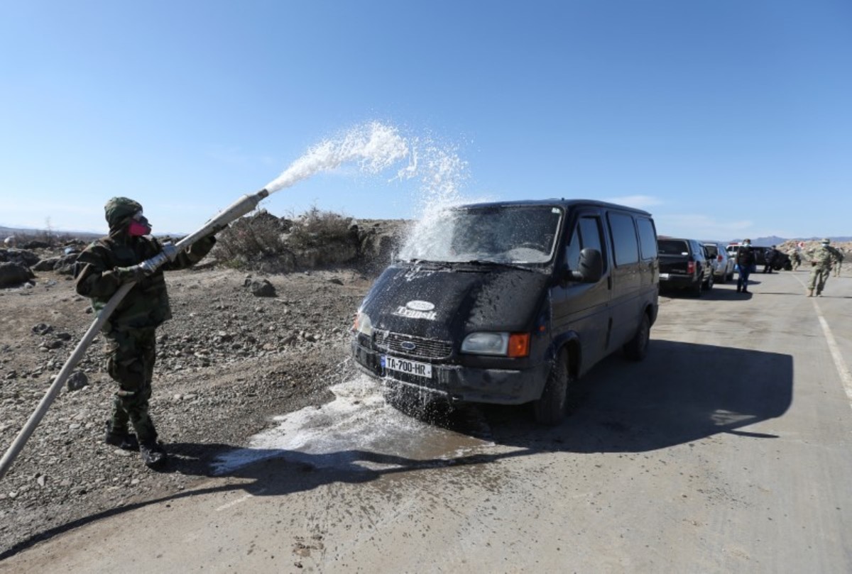 A Georgian serviceman wearing protective gear washes a van at a check point, after authorities tightened up measures to prevent the spread of coronavirus disease (COVID-19), in Marneuli near Tbilisi, Georgia March 23, 2020. REUTERS/Irakli Gedenidze