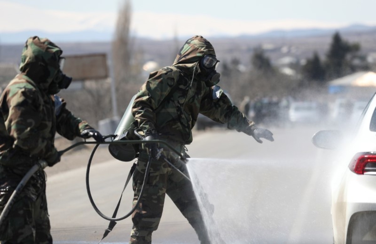 Georgian servicemen wearing protective gear wash a car at a check point, after authorities tightened up measures to prevent the spread of coronavirus disease (COVID-19), in Marneuli near Tbilisi, Georgia March 23, 2020. REUTERS/Irakli Gedenidze