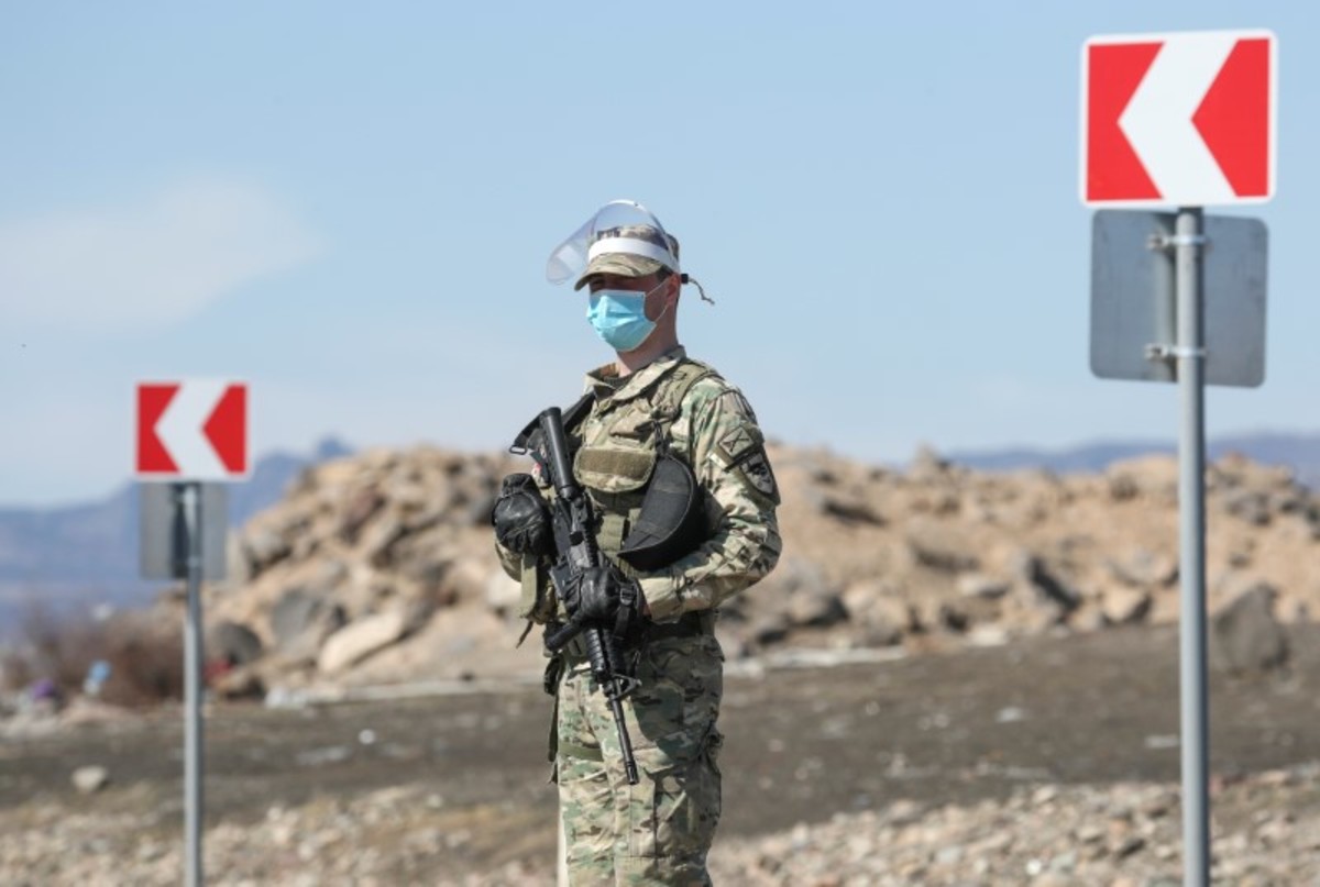 Georgian servicemen wearing protective masks stand guard at a check point, after authorities tightened up measures to prevent the spread of coronavirus disease (COVID-19), in Marneuli near Tbilisi, Georgia March 23, 2020. REUTERS/Irakli Gedenidze
