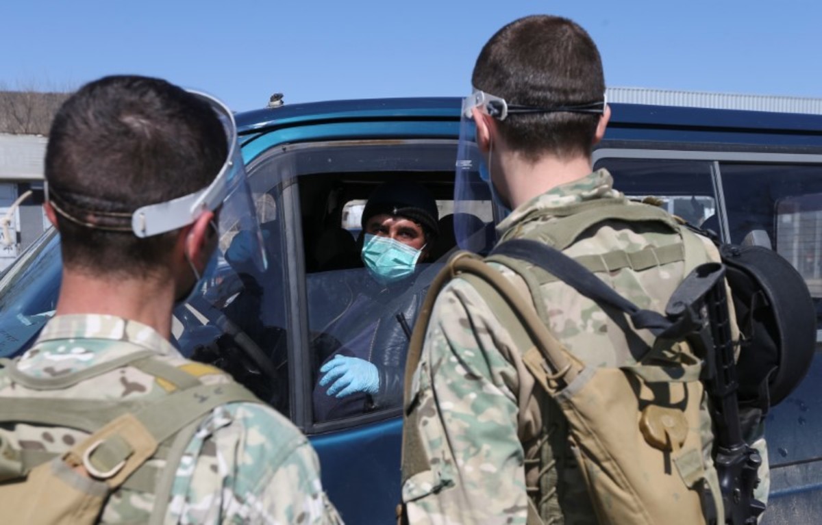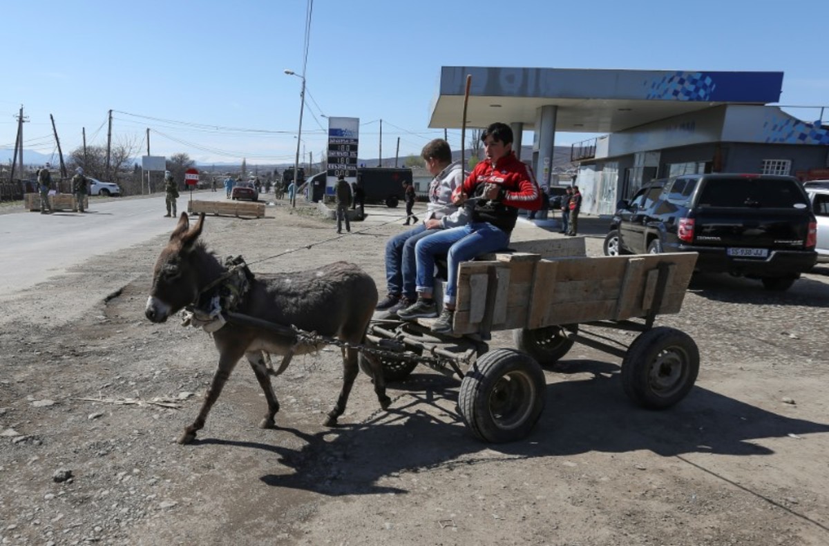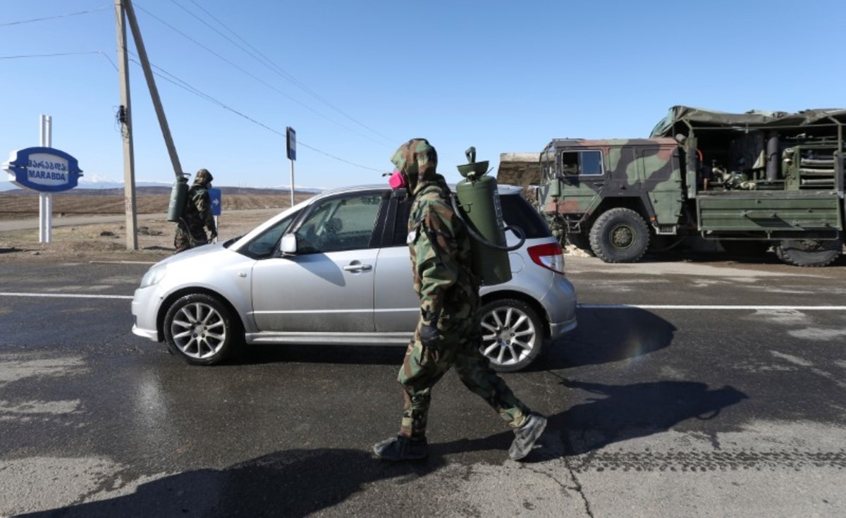 Boys sit on a donkey-drawn cart near a check point, after authorities tightened up measures to prevent the spread of coronavirus disease (COVID-19), in Marneuli near Tbilisi, Georgia March 23, 2020. REUTERS/Irakli GedenidzeGeorgian servicemen speak with a driver at a check point, after authorities tightened up measures to prevent the spread of coronavirus disease (COVID-19), in Marneuli near Tbilisi, Georgia March 23, 2020. REUTERS/Irakli GedenidzeA Georgian serviceman wearing a protective mask stands guard as an ambulance drives through a check point, after authorities tightened up measures to prevent the spread of coronavirus disease (COVID-19), in Marneuli near Tbilisi, Georgia March 23, 2020. REUTERS/Irakli GedenidzeGeorgian servicemen spray disinfectant while sanitizing vehicles to prevent the spread of coronavirus disease (COVID-19) at a check point in Marneuli near Tbilisi, Georgia March 23, 2020. REUTERS/Irakli Gedenidze