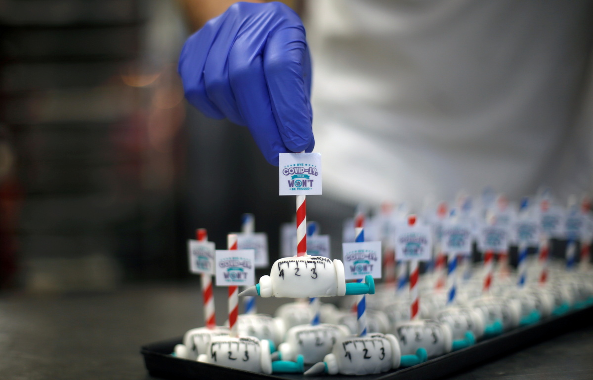 A spoonful of sugar helps the medicine go down at a bakery in the western German town of Dortmund, which is celebrating the year of the coronavirus vaccine with syringe-shaped cakes.