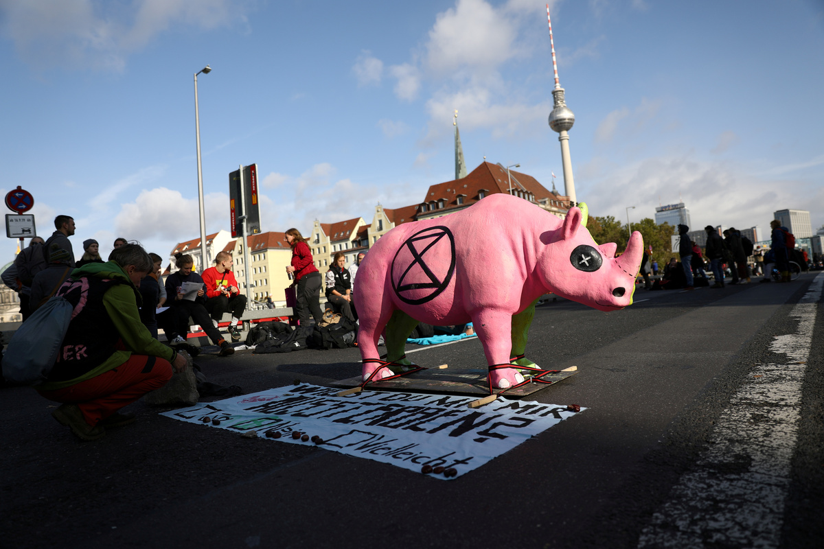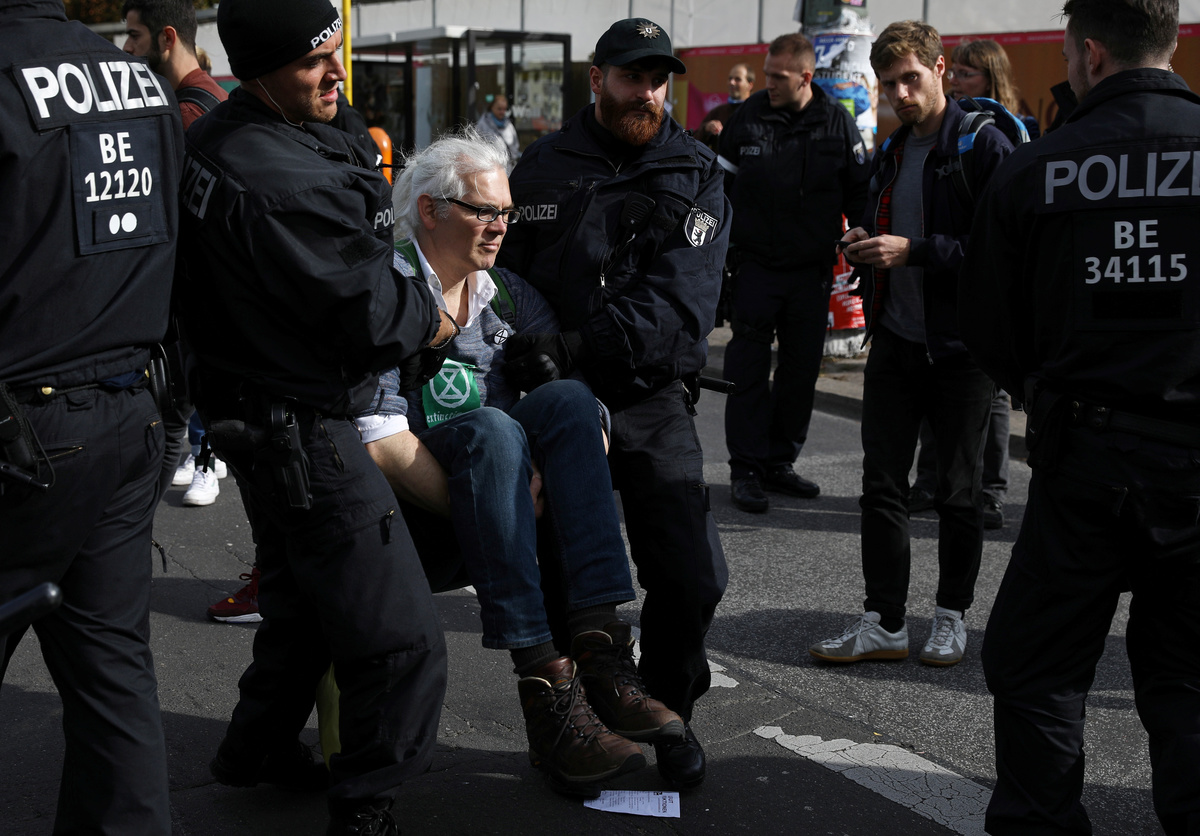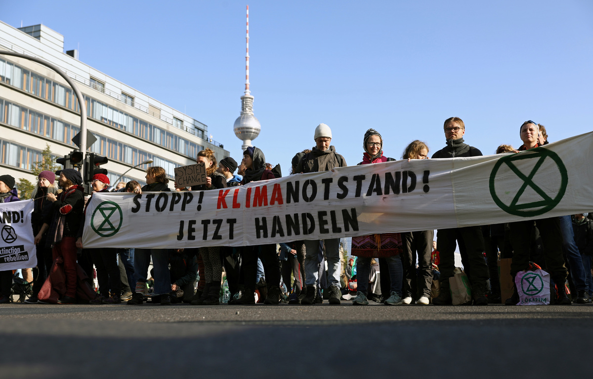 As Merkel and her ministers met at the chancellery in Berlin, hundreds of Extinction Rebellion activists blocked a nearby bridge on the third day of global protests to press governments to do more to combat global warming.